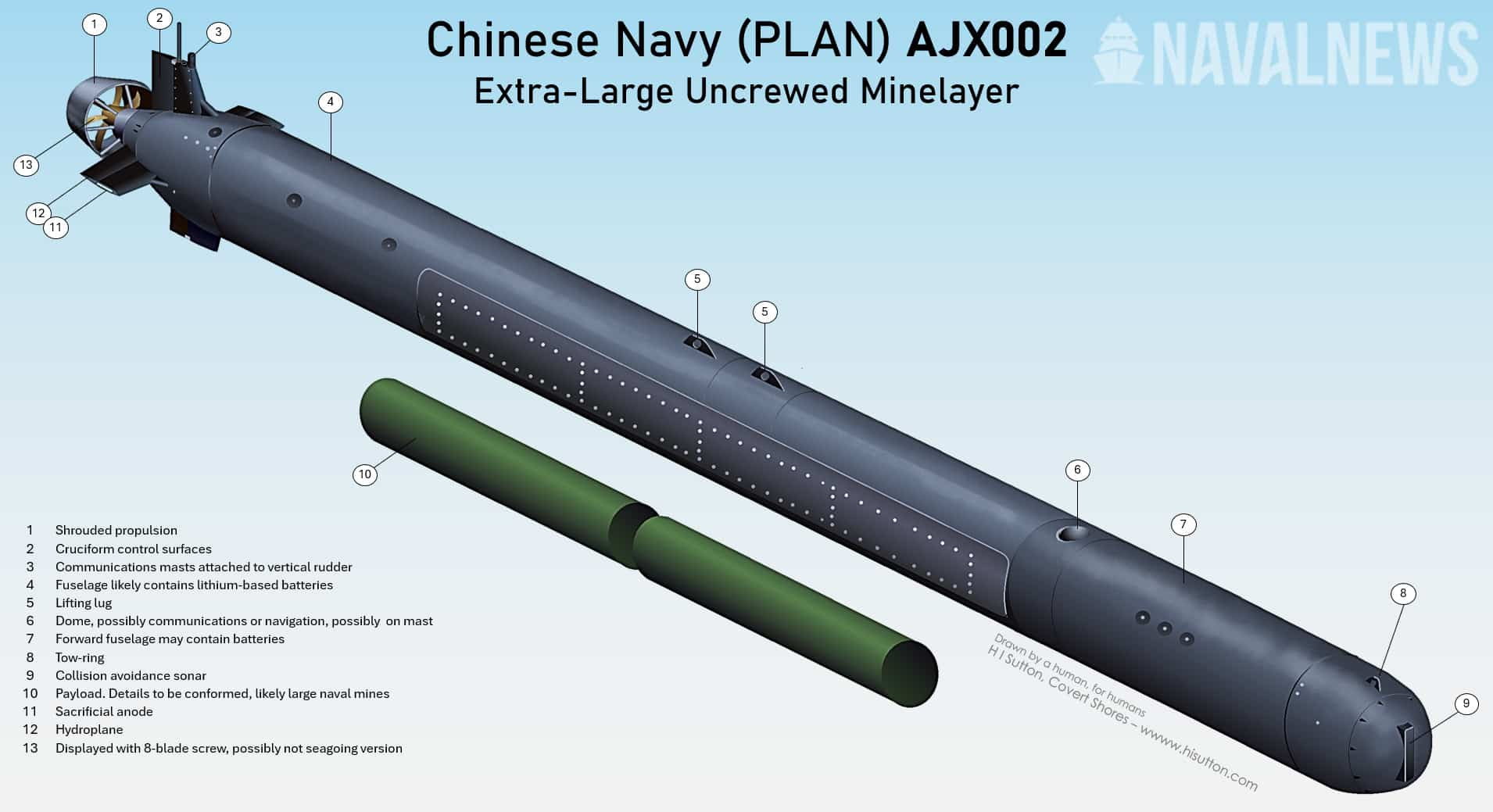 Having said that, it is almost certainly weaponised. Such a large system, without substantial masts, is unlikely for ISR (intelligence surveillance and reconnaissance). Possibly the AJX-002 is some form of mine, possibly a self-deploying torpedo armed mine for deep water minefields (popularly a CAPTOR mine).