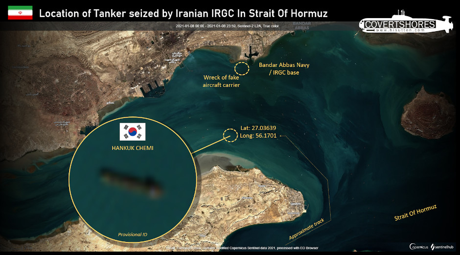 A satellite overpass today has made it possible to provisionally identify the anchor location of the tanker seized by Iran on January 4. The South Korean Hankuk Chemi (IMO: 9232369) was boarded by the IRGC (Islamic Revolutionary Guards Corp) by small boat and helicopter. It was taken in toward the major naval base at Bandar Abbas.