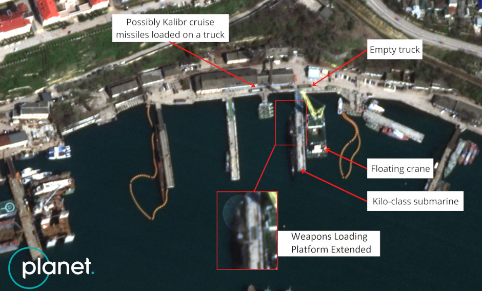 Satellite image from Planet, analysed by Benjamin Pittet (Twitter) shows one example of an Improved KILO Class submarine reloading during the Ukraine War.