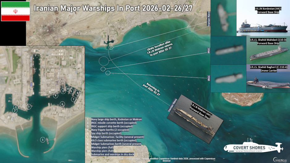 As the world speculates on U.S. strikes on Iran, the Iranian Navy and I.R.G.C Navy (Islamic Revolutionary Guard Corps) are not showing significant signs of dispersing or otherwise attempting to protect their force. Vessels are in predictable locations, particularly around the major naval base at Bandar Abbas.