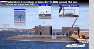 Two Russian Navy KILO Class submarines have been photographed in Kronstadt, the naval base in St Petersburg. The photo reveals details of their anti-drone (aerial drones – UAVs and surface drones – USVs) defences…